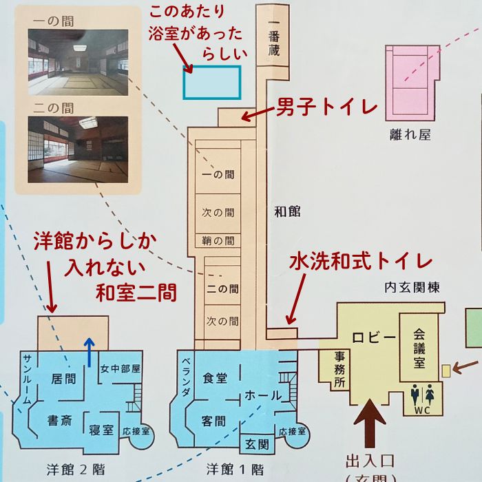 妄想させていただきますが、見取り図で見ると、二の間の次の間と洋館食堂の隙間に空間があります。次の間から見ると襖だったので、押入れに見えました。でもこの押し入れの中に隠し階段があったら…二階は超プライベート空間になりますね。まわりの目を気にせずに、のんびり過ごせそうじゃないですか?そういうの大好きなのでワクワクします。