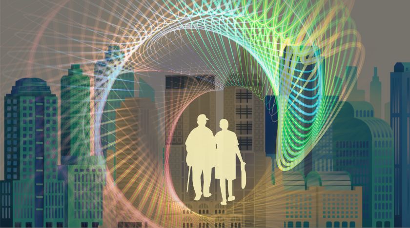 右のスクリーンの前に誰か2人いて、スクリーンを見つめています。